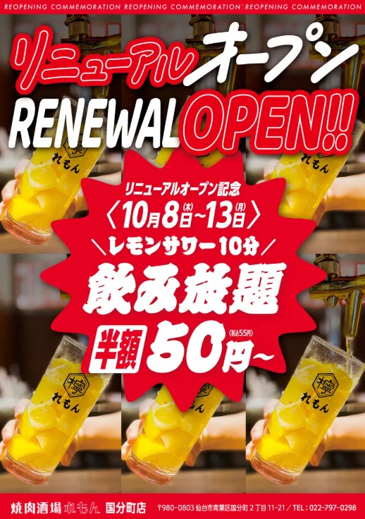 株式会社セイザン|お知らせ NEWS お知らせ ホーム お知らせ 焼肉酒場れもん国分町店 リニューアルオープンのお知らせ 2025.10.08 お知らせ 焼肉酒場れもん国分町店 リニューアルオープンのお知らせ 一覧へ戻る CATEGORY お知らせ ARCHIVE 2025